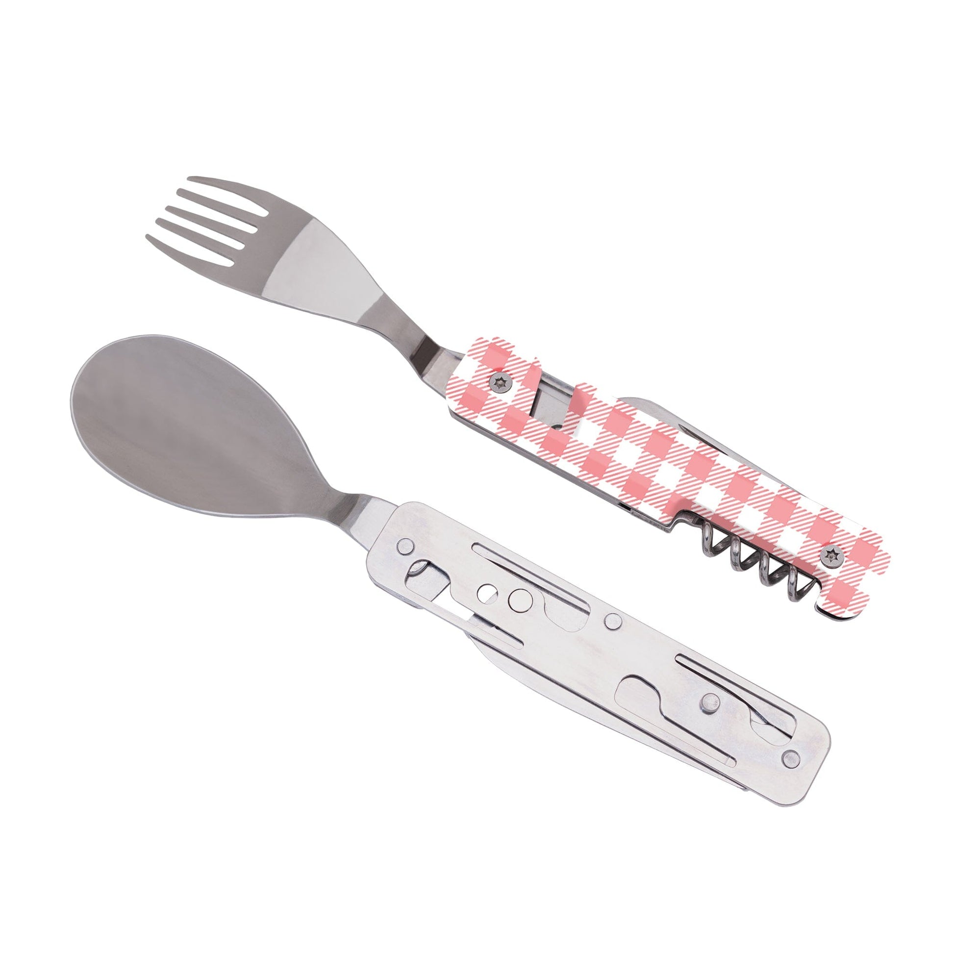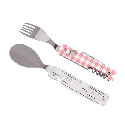 Fabriqués en acier inoxydable 2CR14, ils intègrent une grande cuillère, une fourchette à cinq dents, un couteau à lame micro-dentée, un tire-bouchon à quatre spirales, un ouvre-boîte et un décapsuleur.