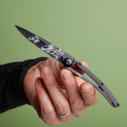 Ce couteau allie légèreté et élégance grâce à sa conception en acier inoxydable Z40C13 avec une finition titane noir. Sa lame, ornée d’une gravure laser délicate, est équipée d’un cran de sécurité de type liner lock pour une utilisation sécurisée. Son manche en ébène apporte une touche de raffinement et un confort optimal en main. Pratique et discret, il est également doté d’un clip de ceinture pour un transport facile.